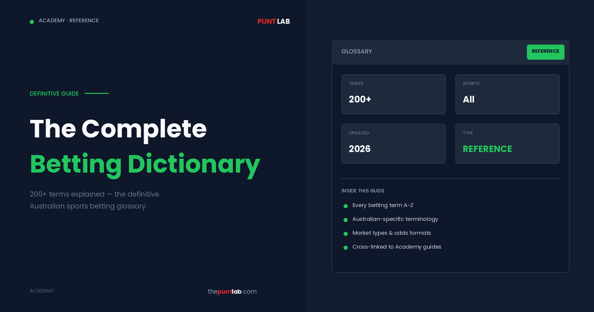 The definitive Australian sports betting glossary. Over 200 terms explained in plain English — from accumulator to zig-zag theory, covering every market type, odds format, strategy concept, and piece of betting jargon you’ll encounter.