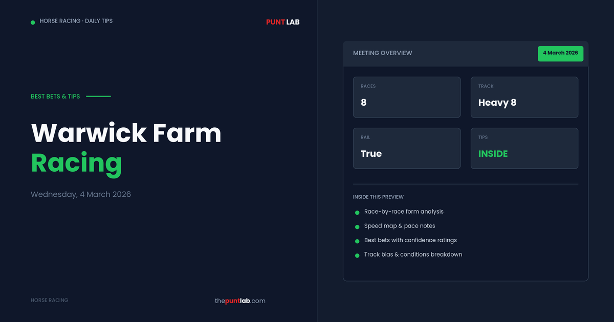 A Heavy 8 at Warwick Farm typically shifts the edge to horses with proven wet-track form and the ability to sustain momentum, not just sprint. It can also punish wide runs and make it harder to circle the field, so barriers and settling positions become central to assessing realistic winning chances.