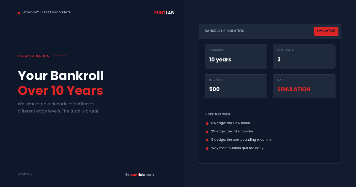 But what does a realistic betting journey look like over 5,000 bets — the roughly 500 bets per year that a serious recreational punter places over a decade? What happens to your bankroll during the 18-month periods where variance turns against you despite doing everything right? And what does the difference between a 0% edge, a 2% edge, and a 5% edge actually look like when it plays out over years, not weeks?