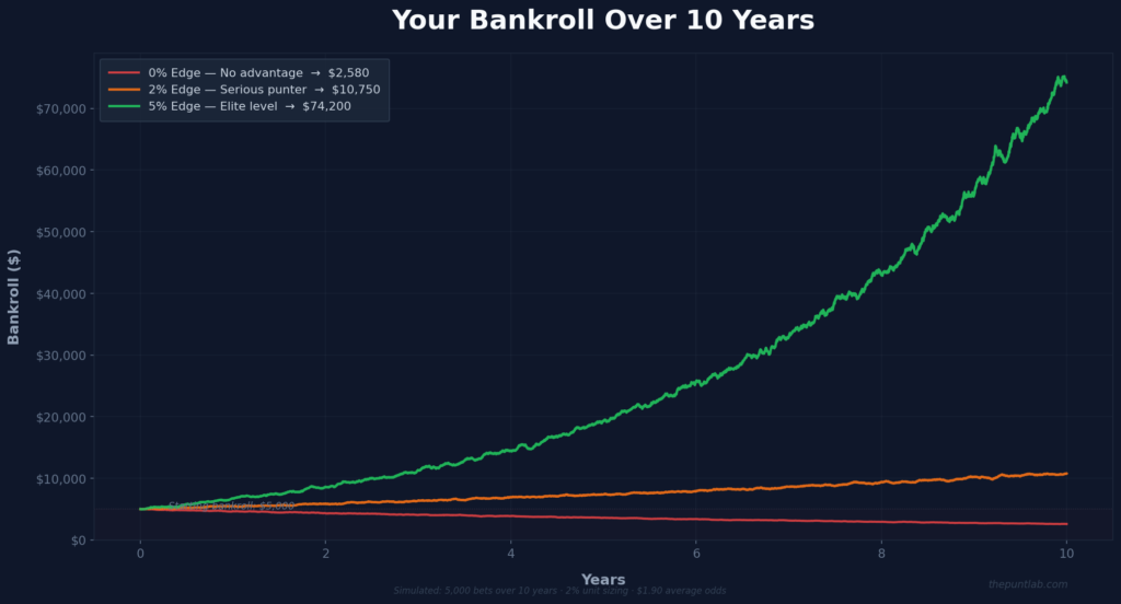 But the maths doesn’t lie. A 2% edge, applied consistently with disciplined staking over 5,000 bets, more than doubles your money. A 5% edge turns $5,000 into $74,000. And a 0% edge slowly, quietly gives your money to the bookmaker at a rate of roughly 5% per year.