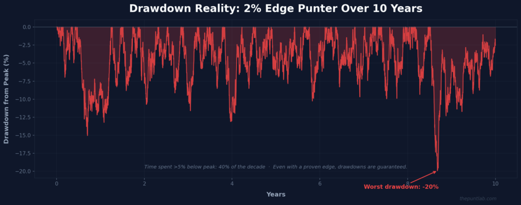 Year 10: Bankroll: $10,750. Up 115%. The starting $5,000 has more than doubled. But here’s what the final number doesn’t show: at various points during the decade, the bankroll was down 15-20% from its peak. Those drawdowns lasted 3-8 months. During those months, the punter felt like they were losing, like the edge had disappeared, like everything they believed about their process was wrong.